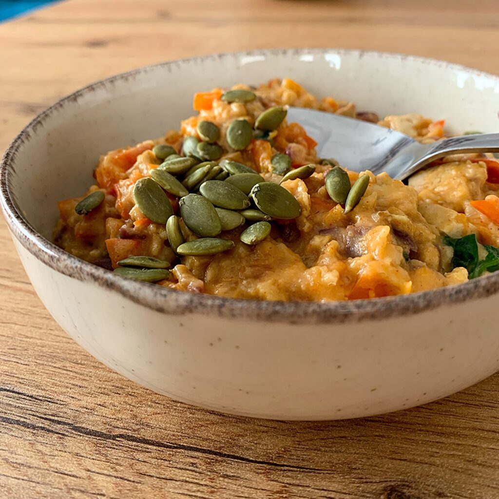 2. Miután a paradicsom és a spenót összeesett, add hozzá a zabot, a kesukrémet vagy a növényi tejszínt és a növényi tejet.
